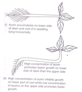 Due to gravity auxins migrate to the lower side of a horizontal stem; higher auxin concentration on the lower side in the shoot promotes faster growth on the lower side than on the upper side causing the shoot tip to grow upwards; while in the root, lower auxin concentration on the upper side promotes faster growth/elongation on the upper side than on the lower side, hence the root grows downwards