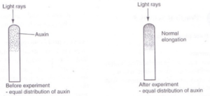 Under uniform light distribution, auxins produced from the shoot apex are translocated evenly down the shoot, therefore there is equal growth rate in the zone of elongation leading to normal increase in height of the shoot.