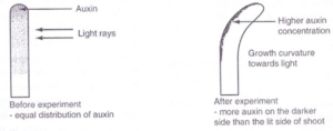 On exposure to unidirectional light; auxins migrate to the darker side of the shoot tip; Higher auxin concentration causes faster growth (elongation) on the darker side than lit side; hence growth curvature towards light.