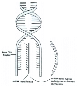 In the RNA, Thymine (T) is replaced by the base Uracil (U). The transfer of DNA base sequence on to the m-RNA leaves the nucleus with the full instructions from the DNA about the kind of protein to be synthesized by the cell.