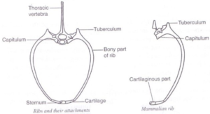 The ribcage is made of ribs articulating with the vertebral column to the back and the sternum to the front.