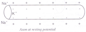 A non-conducting nerve fibre is described to be resting potential. In this state there are more Na+ outside the axon membrane than inside in relation to the concentration of K+ which is higher within the axoplasm.